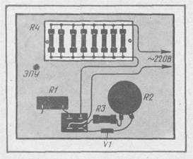 Настало время испытать усилитель в действии. Поверните ручку переменного резистора R3 (регулятор громкости) по часовой стрелке до упора и дотроньтесь пинцетом до входного вывода резистора R1. В наушниках должен прослушиваться звук низкого тона. Устанавливая движок резистора в разные положения, вы заметите, что изменяется и громкость звука. А теперь займемся включением ЭПУ в сеть. Электродвигатель Э-ПУ рассчитан на напряжение 127 В и обычно подключается в электрофоне к трансформатору, от которого питается усилитель. У вас такого трансформатора нет, и нужно придумать, как включить электродвигатель в сеть напряжением 220 В. Самый простой способ — погасить излишек напряжения с помощью резистора (R4), включенного в цепь питания электродвигателя (рис. 68, а). Но мощность резистора должна быть большая — 15 Вт. В продаже такие резисторы встречаются редко, поэтому придется использовать резисторы МЛТ-2,0 мощностью 2 Вт — всего понадобится 8 таких резисторов сопротивлением по 10 кОм, соединенных параллельно. Резисторы надо сначала установить на плате из изоляционного материала (рис. 68, б) и прикрепить плату снизу к панели проигрывателя вблизи его контактной планки. Затем соединяют резисторы с выводами планки, как показано на рис. 69. Сетевые провода должны быть в хорошей изоляции (лучше применять сетевой шнур) и иметь длину 1,5 — 2 м. Концы проводов, предназначенные для включения в сеть, следует подсоединить к двухштырьковой вилке — ее и вставляют в розетку. Сразу же после монтажа гасящего резистора проверьте работу проигрывателя — при установке переключателя 2 в положение «Пуск», а переключателя 1 в положение «33» или «45», диск проигрывателя должен вращаться с заданной скоростью. Можете теперь подключить звукосниматель к усилителю. Оплетку провода соедините с общим проводом усилителя (плюс батареи питания), а сам провод подключите к выводу резистора R1. Поставьте на проигрыватель грампластинку и послушайте звук в телефонах. Громкость его должна регулироваться переменным резистором R3. Если громкость недостаточна даже при максимальном сопротивлении резистора, удалите из усилителя резистор RA или замкните его выводы проволочной перемычкой.