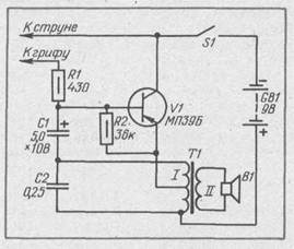 В исходном состоянии никакого звука в динамической головке нет. При нажатии на струну, скажем, в середине ее в цепь базы транзистора окажется включенной половина обмотки грифа, и в головке раздастся звук определенной тональности. Перемещая палец по струне вверх и вниз, можно изменять соответственно тональность звучания. Чтобы получить возможно больший диапазон изменения тональности, намотанный на гриф провод должен иметь возможно большее сопротивление. А это в свою очередь зависит от используемого провода. Наиболее подходящий провод марки ПЭЛ или ПЭВ диаметром 0,1 мм. Он достаточно тонкий, и обращаться с ним нужно осторожно, чтобы не порвать. Такой провод намотайте виток к витку на гриф негодной гитары на длине 400 — 450 мм. С грифа нужно заранее удалить все лишнее, чтобы поверхность его была гладкой. Начало обмотки (ближе к резонатору гитары) подключите в дальнейшем к резистору R1, а конец закрепите каплей клея или другим способом. Стальную струну натяните над обмоткой (на расстоянии 5 — 6 мм) между двумя стойками. Предварительно наметьте линию на обмотке, над которой будет висеть струна, и зачистите под ней дорожку шириной 8 — 10 мм — снимите изоляцию с провода по всей длине обмотки. Воспользуйтесь для этой операции лезвием бритвы или мелкозернистой шлифовальной шкуркой. Изоляцию счищайте вдоль витков, иначе повредите провод. Проверьте после этого полное сопротивление обмотки (подключите щупы омметра к выводам обмотки) — при ширине грифа 60 мм и толщине 10 мм оно должно быть около 1200 Ом. Лучшие результаты получатся, если использовать провод из материала, обладающего высоким удельным сопротивлением (манганин, константан, нихром). Тогда удастся довести сопротивление обмотки до 5000 Ом, а значит, и диапазон изменения тональности звука будет большим. Провод должен быть в эмалевой изоляции, иначе его придется, наматывать с небольшим «шагом» — зазором между витками (во избежание замыкания между ними). Трансформатор Т1 выходной от любого малогабаритного, транзисторного приемника, но обязательно со средним выводом у первичной обмотки. Динамическую головку желательно применить мощностью 1 Вт (1ГД-18, 1ГД-28, 1ГД-40 и др.). Транзистор типа МП39Б, МП40, МП41, МП42А, МП42Б с коэффициентом передачи тока не ниже 30. Резисторы — МЛТ-0,5, электролитический конденсатор С1 — ЭМ, К50-6, К50-12 на напряжение не менее 10 В, конденсатор С2 — МБМ, выключатель питания — ТВ2-1, источник питания — две последовательно соединенные батареи 3336Л напряжением по 4,5 В.