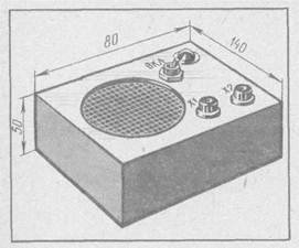 Смонтированную плату надо закрепить в корпусе (рис. 129) со съемной нижней крышкой. В верхней стенке корпуса просверлите отверстия под выключатель и лампу, напротив диффузора головки вырежьте отверстие — закройте его декоративной тканью или прикрепите сверху пластмассовую решетку. Плату с деталями можно прикрепить к верхней стенке винтами, но она будет надежно удерживаться гайкой, навинченной поверх стенки на корпус выключателя. На верхней стенке установите зажимы, а батарею питания разместите внутри корпуса на любой из стенок или прикрепите ее металлической скобой к нижней крышке. Соединения между платой, батареей и зажимами выполняют многожильным монтажным проводом в изоляции. Налаживать сигнализатор несложно. Подав выключателем S1 питание, временно соедините между собой эмиттер и коллектор транзистора V2 и подключите таким образом генератор и лампу Н1 к источнику питания. Лампа должна загореться, а из динамической головки раздаться звук. Если этого нет, в монтаже была допущена ошибка. Устраните ее. Затем снимите перемычку между эмиттером и коллектором транзистора V2, а зажимы XI и Х2 замкните между собой. Лампа может загореться ярко, как и при непосредственном подключении ее к батарее питания. Такая яркость, конечно, не нужна, и ее следует уменьшить во избежание излишнего тока через транзистор V2 и его нагрева. Для этого включите последовательно с резистором R1 переменный резистор сопротивлением 2,2 или 3,3 кОм и, перемещая его движок, установите напряжение на лампе равным 2,5 — 3 В. Затем измерьте получившееся общее сопротивление (переменный резистор и постоянный R1) и впаяйте резистор с таким сопротивлением вместо R1. Если же яркость свечения лампы при замыкании зажимов будет недостаточна, нужно несколько уменьшить сопротивление резистора R1. Но это может случиться лишь при использовании транзисторов V1 и V2, обладающих коэффициентом передачи тока ниже указанного значения. В этом случае для получения нужной задержки придется увеличить емкость конденсатора С1 до 200 — 300 мкФ.