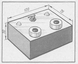 Плату с деталями прикрепите к лицевой стенке корпуса (рис. 132). Для этого просверлите в стенке отверстие под выключатель, два отверстия под лампы и еще два отверстия под винты диаметром 3 мм, через эти отверстия пропустите винты и закрепите на них внутри корпуса плату. Лампы желательно закрыть прозрачными колпачками. Сверху к лицевой стенке прикре пите кнопки. Заранее просверлите под ними отверстия и пропустите внутрь корпуса проводники от контактов кнопок. Батарею питания расположите в удобном месте внутри корпуса. Можно также прикрепить ее металлической кнопкой к съемной нижней крышке. Настало время проверить игру в действии и отрегулировать ее. Но вначале, как обычно, внимательно просмотрите весь монтаж и сверьте его со схемой. Затем подайте выключателем питание и нажмите кнопку 51. Должна загореться лампа H1. Отпустите кнопку 51 и нажмите 52. Теперь должна загореться лампа Н2. Проверьте четкость работы конструкции. Нажмите кнопку 51 и, не отпуская ее, кнопку 52. Если при этом лампа H2 начнет постепенно зажигаться (может и вспыхнуть сразу, погасив лампу HI), следует подобрать резистор R2 с меньшим сопротивлением (или увеличить сопротивление резистора R1). Далее нажмите кнопку 52, а вслед за ней 51. Лампа Я2 должна продолжать гореть. Если начнет зажигаться лампа H1, значит, сопротивление резистора R2 вы уменьшили слишком сильно. Нужно точнее подобрать его сопротивление. Можно поступить иначе. Нажав сначала кнопку 51, измерьте вольтметром напряжение на лампе HI, затем, отпустив кнопку 51 и нажав на 52, — на лампе Н2. Подбором сопротивления одного из резисторов добейтесь равенства этих напряжений (их значения не должны быть более 3 В). Причем, если нужно изменить напряжение на лампе HI, следует подбирать сопротивление резистора R2 (чем меньше значение, тем больше напряжение на лампе). Вполне вероятно, что никакой подстройки делать не придется, если будут использованы транзисторы с одинаковыми коэффициентами передачи тока. В редких случаях может проявиться и такой эффект, как самопроизвольное зажигание одной (а еще реже двух) лампы. Устранить это можно включением между базой и эмиттером транзисторов V1 и V4 резисторов сопротивлением по 510 Ом — 1 кОм. Добившись четкой работы самоделки, закройте нижнюю крышку и предложите друзьям посостязаться в скорости реакции.