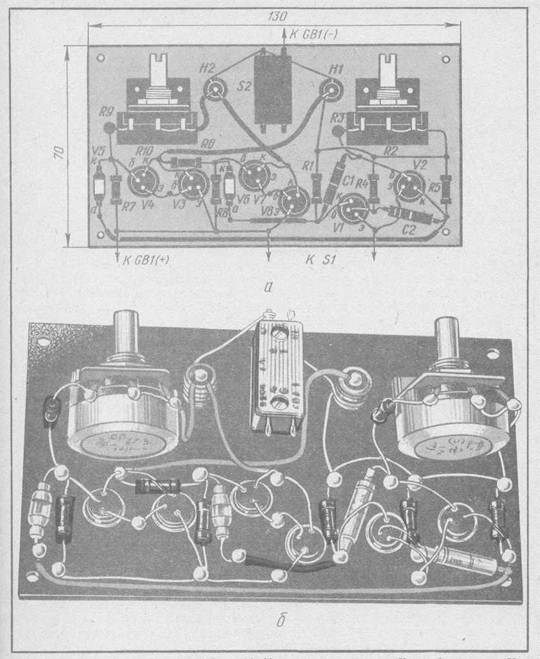 Рис. 134. Монтажная плата игры «Красный или зеленый?»: а — расположение деталей; б — внешний вид смонтированной платы