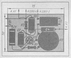 Рис. 137. Схема «миноискателя» Рис. 138. Расположение деталей генератора «миноискателя» на монтажной плате В качестве датчика удобно использовать капсюль от головных телефонов ТОН-1, ТОН-2 или им подобных с сопротивлением обмотки не менее 1 кОм. Но капсюль придется доработать — об этом будет сказано позже. Транзистор должен быть МП39Б, МП42Б с коэффициентом передачи тока не ниже 35 (иначе генератор не будет работать). Постоянные резисторы — МЛТ-0,5, переменный — СП-1. Конденсаторы типа МБМ. Головные телефоны — ТОН-1, ТОН-2 или аналогичные. Выключатель питания — тумблер ТВ2-1, источник питания Gfil — батарея «Крона», разъем XI любого типа с двумя гнездами под вилку головных телефонов.