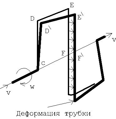 Расходомеры фирмы KROHNE – модель MFM 2081 и MFM 3081 используют физический эффект называемый силой Кориолиса. Сила вводится для учета влияния вращения подвижной системы отсчета на относительное движение материальной точки. Физический эффект состоит в том, что во вращающейся системе отсчета материальная точка, движущаяся параллельно оси этого вращения, отклоняется по направлению, перпендикулярному к ее относительной скорости или оказывает давление на тело, препятствующее такому отклонению. В системах где присутствует сила Кориолиса возникает ускорение Кориолиса – как следствие изменения относительной скорости движения материальной точки при переносном движении и переносной скорости при относительном движении материальной точки. Переносное движение – движение всех точек подвижной системы относительно условно неподвижной. Собственно принцип действия расходомеров фирмы KROHNE и основан на кориолисовом ускорении. На Рис 5 видно, что на участке CD частицы протекающей среды будут ускорятся, на участке EF напротив тормозится. В результате трубка деформируется (DD\ EE\ FF\) как показано на рисунке. Трубка со средой не обязательно вращается на 3600, ее достаточно вращать по неполной круговой орбите. Расходомеры данного типа позволяют измерять расход независимо от плотности, давления, температуры, вязкости и поведения измеряемой среды. Наличие воздушных пузырьков и малых твердых частиц не влияет на точность измерения расхода, в отличии от расходомеров использующих ультразвуковой принцип измерения.