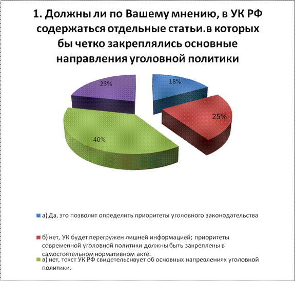 В данном разделе представлены полученные результаты проведенного исследования в виде круговых диаграмм. В первую очередь нас интересовал вопрос о том необходимо ли закрепление положений уголовно-правовой политики в Уголовном кодексе. Несмотря на то, что только 18% респондентов заявили о необходимости закрепления положений уголовно-правовой политики в Уголовном кодексе, еще 25 % высказали мысль о формулировании концепции уголовно-правовой политики в отдельном нормативном акте. Кроме того были высказаны иные мнения, их 23 %, обозначенные в диаграмме фиолетовым цветом: Один респондент указал, что в УК РФ должны содержаться отдельные статьи, в которых бы закреплялись основные направления уголовной политики, но они должны быть четко выраженными. Один респондент ответил: нет, так как приоритеты уголовного законодательства должны вытекать из его норм. Один респондент считает, что основные направления уголовной политики – это теоретические вопросы, поэтому они не должны закрепляться в УК. Один респондент полагает, что не должны, так как это усилит декларативность УК. Четыре респондента считают, что основные направления уголовной политики должны содержаться в отдельном законе или ином нормативном акте, издаваемом каждые 3 или 5 лет. Десять респондентов не указали, какой конкретно иной позиции они придерживаются. Высказанные мнения в целом свидетельствуют об актуальности темы, осведомленности респондентов.