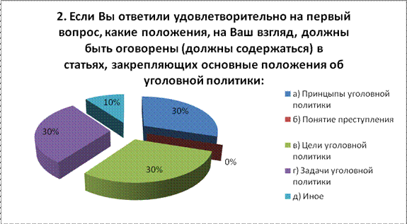 Этот вопрос явился продолжением первого вопроса. Авторам, ответившим положительно на вопрос о необходимости формирования и законодательного закрепления основных положений уголовно-правовой политики, а таких было большинство (см. диаграмму 1), были предложены различные варианты ответа. По 1/3 респондентов (по 30 %) высказались о том, что в статьях, содержащих положения об уголовно-правовой политике должны закрепляться цели, задачи, принципы уголовно-правовой политики. 10 % высказали иные мнения. В том числе: Один респондент указал на необходимость закрепления целей и основных направлений уголовной политики. Один респондент отметил необходимость закрепления именно направлений и конечной цели уголовной политики. Один респондент, указав на «иное», не мотивировал свой ответ Ни один из опрошенных не связал воедино понятие преступления и основные положения уголовно-правовой политики.
