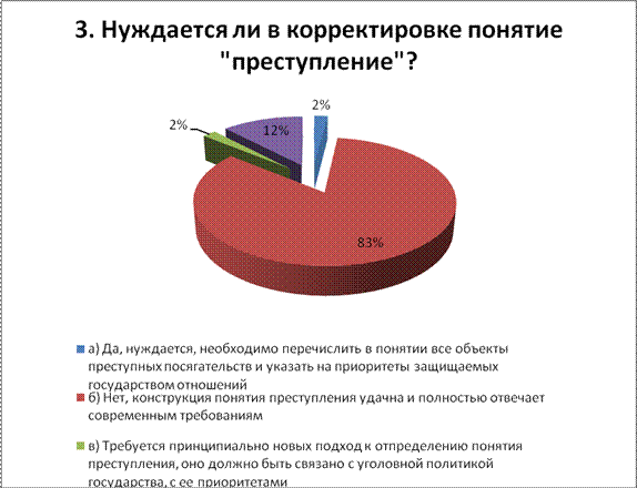 Следующий вопрос направлен на выяснение того, нуждается ли понятие преступления в корректировке. Несмотря на то, что понятие преступления является базовым теоретическим понятием и на страницах современных изданий мало обсуждаемым, при ответе на вопрос возникла некоторая дискуссия, свидетельствующая об интересе отдельных ученых и практиков к поднятой проблеме. 83 % респондентов отметили, что никакие коррективы не нужны, так как конструкция понятия преступления удачная, она полностью отвечает современным потребностям общества и устраивает правоприменителя. 2 % заявили о необходимости принципиально нового подхода к понятию преступления, о том, что оно должно быть связано с уголовно-правовой политикой государства, с ее приоритетами. Еще 2 % указали на необходимость перечисления объектов преступных посягательств. Были высказаны и иные мнения (12 % респондентов), в частности: Один респондент указал, что корректировка требуется, но не в связи с уголовной политикой. Один респондент считает, что следует разграничить понятия преступления и уголовно-правового запрета. Один респондент указал на необходимость раскрытия понятия «общественная опасность». Один респондент отметил, что необходимо слова «под угрозой наказания» заменить «наказуемостью». Мотивировка была следующей: речь идет о понятии преступления, а не о применении наказания. Шесть респондентов не указали, какой конкретно иной позиции они придерживаются.