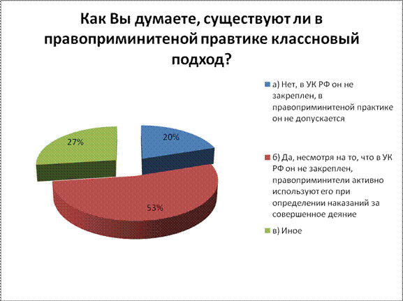 Следующий вопрос был направлен на выяснение мнения о том, существует ли в правоприменительной практике классовый подход, отвергаемый современным законодателем. Полагаем, что результаты анкетирования показали, что отсутствие классовости – это тот идеал, к которому следует стремиться. 53 % опрошенных положительно ответили на поставленный вопрос. Примечательно, что об этом же пишется в научных изданиях, об этом же свидетельствуют и данные нашего анкетирования. Полагаем, что с этими результатами нельзя не считаться. Вместе с тем 20 % респондентов указали на то, что, если в законе классовый подход запрещен, то и в правоприменении его не может быть. 27 % высказали следующие иные мнения. Один респондент указал, что в правоприменительной практике классовый подход не существует (без мотивировки). Двенадцать респондентов не уточнили, какой иной позиции они придерживаются. Один респондент полагает, что классовый подход в законодательной деятельности присутствует. Один респондент считает, что само понятие «классовый подход» устарело и неприменимо в современных условиях. Два респондента указали на то, что классовый подход в правоприменении обусловлен классовым характером уголовного права. Один респондент полагает, что классовый подход существует в правоприменительной практике, и объясняет это природой любого УК. По мнению одного респондента, если классовый подход в правоприменительной практике имеет место, то это неконституционно, а следовательно, и недопустимо. Один респондент ответил: классовый подход в правоприменительной практике существует, рыночные отношения неизбежно проявляются и в правоприменительной практике. Два респондента затрудняются с ответом. Как видно, предложенная тема актуальная и дискуссионная.