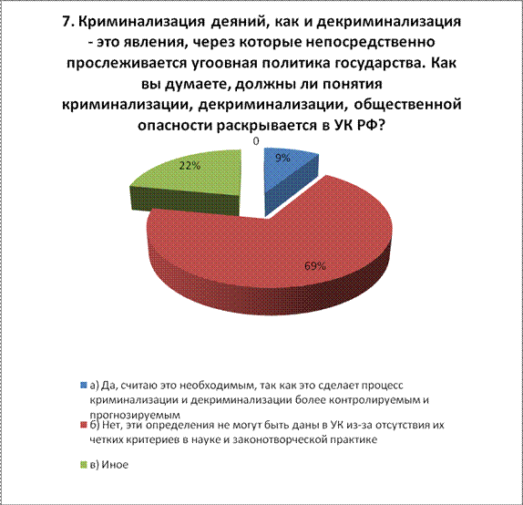 Указав на связь криминализации и декриминализации с уголовно-правовой политикой, мы предполагаем выяснить, должны ли понятия криминализации, декриминализации, общественной опасности раскрываться в УК РФ. 69% респондентов указали, что такие понятия закрепить в УК нельзя из-за отсутствия их четкой формулировки в науке, а, следовательно, и в правоприменении. 9 % опрошенных считают, что такие определения необходимы. Мы согласны с ними и полагаем, что это сделает процесс криминализации и декриминализации более контролируемым и прогнозируемым. Были высказаны и иные мнения (22 %). Два респондента полагают, что понятия криминализации, декриминализации, общественной опасности не должны раскрываться в УК РФ, достаточно их нахождения в доктрине уголовной политики. Два респондента считают, что определения криминализации, декриминализации, общественной опасности не могут быть даны в УК. Этим понятиям не нужна законодательная форма. Два респондента полагают, что в этом нет необходимости. Один респондент указывает на то, что критерий общественной опасности можно раскрыть в уголовном законе. Один респондент отвечает: «Нет, так как это не входит в предмет уголовного законодательства». Десять респондентов, указав «иное», не мотивировали свой ответ. Такой значительный процент «иного мнения» объясняется, на наш взгляд, тем, что желание познать эти понятия есть, а вот пути познания респонденты не видят, вместе с тем, отметим, что это сложный вопрос, над разрешением которого работают поколения ученых.
