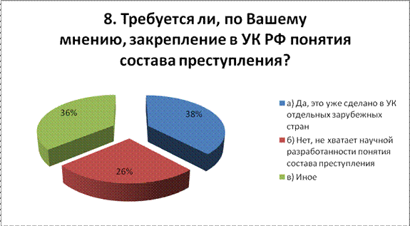 Следующий вопрос был направлен на выявление мнения о необходимости закрепления в законодательном порядке наряду с понятием преступления понятия состава преступления. Мнения сторонников и противников разделились фактически поровну (соответственно 38 % и 36 %). Были высказаны и иные мнения (26 %). Два респондента указали на возможность закрепления в УК РФ понятия состава преступления. Три респондента ответили «нет» без мотивировки ответа. Один респондент затрудняется в ответе на вопрос. Четыре респондента ответили: «Нет, достаточно теоретических концепций». Два респондента ответили: «Нет, это излишне». Два респондента ответили: «Пробел налицо – о составе преступления в УК говорится, а его понятие отсутствует». Шестнадцать респондентов, указав «иное», не мотивировали свой ответ. Тем самым результаты исследования подтвердили дискуссионность вопроса.