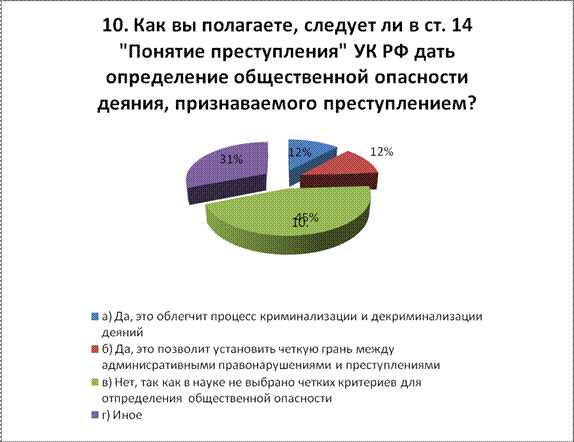 45 % респондентов не видят возможности, каким образом можно ввести в УК РФ понятие «общественная опасность», так как в науке не выработано его четких критериев. По 12 %, а всего 24 % желали бы видеть это понятие в УК РФ. Были и иные мнения. По пункту «г» были высказаны следующие мнения. Один респондент, ответив отрицательно, пояснил, что это решает сам законодатель. Один респондент указал весьма изменчивый характер понятия «общественная опасность». Три респондента считают, что в УК такое определение не требуется вообще. Два респондента затрудняются с ответом. Один респондент ответил «да», мотивируя тем, что это будет служить ориентиром для правоприменителей. Пятнадцать респондентов, указав «иное», не мотивировали ответ. Три респондента дали отрицательный ответ без мотивации.