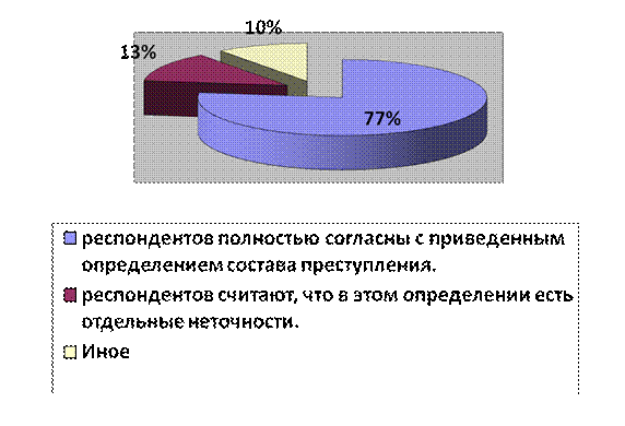 77 % респондентов полностью согласны с приведенным определением состава преступления. 13 % респондентов считают, что в этом определении есть отдельные неточности. По данному вопросу мы, считаем важным особое мнение, которое высказало 10 % опрашиваемых, приведем примеры: Были предложены следующие определения состава преступления: «Под составом преступления следует понимать совокупность его объективных и субъективных элементов и их признаков, необходимую и достаточную для признания конкретного общественно опасного деяния преступлением». «Состав преступления – это юридическая конструкция, представляющая собой совокупность объективных и субъективных признаков, необходимых для квалификации преступлений». «Под составом преступления понимается совокупность установленных уголовным законом признаков, характеризующих общественно опасное деяние в качестве преступления». «Составом преступления называет совокупность объективных и субъективных признаков, которыми должно обладать конкретное общественно опасное деяние, чтобы были признаки преступления». Один респондент указал на то, что в предложенном определении не отражен максимально абстрактный характер состава преступления, его признаки и источник уголовного права. «Под составом преступления следует понимать совокупность его объективных и субъективных признаков, относящихся к специфике объекта, предмета, субъективной и объективной сторон и субъекта, необходимую и достаточную для признания конкретного общественно опасного деяния преступлением». Один респондент предложил под составом преступления понимать совокупность его объективных и субъективных элементов и их признаков, необходимую и достаточную для признания конкретного общественно опасного деяния преступлением либо позволяющую дифференцировать наказуемость деяния. Один респондент предложил заменить в предложенном определении слово «совокупность» на слово «система», так как не совокупность, а система должна быть установлена уголовным законом. «Под составом преступления следует понимать совокупность объективных и субъективных признаков деяния, необходимых и достаточных для признания конкретного общественно опасного деяния преступлением». Один респондент указал на то, что эти признаки содержатся в УК РФ.