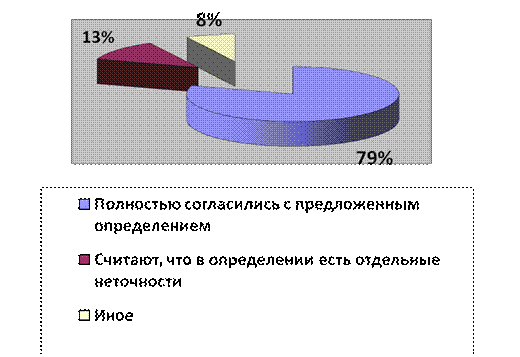 79 % респондентов полностью согласились с предложенным определением. 13 % респондентов считают, что в определении есть отдельные неточности. Иного мнения придерживается 8 % опрошенных, так, например: Два респондента считают, что слово «деяние» следует заменить на «действие или бездействие». Один респондент предлагает исключить такие признаки, как виновность и наказуемость, поскольку они охватываются признаком противоправности. Один респондент предложил перечислить признаки преступления в такой последовательности, которая бы отражала на законодательном уровне приоритеты. Например, если понятие преступления формальное, то на первом месте должен находиться такой признак как противоправность. Один респондент дал следующую формулировку понятия преступления: «Преступлением признается деяние, запрещенное настоящим Кодексом под угрозой наказания». Один респондент указал на то, что слово «деяние» следует пояснить: «в форме действия или бездействия». Один респондент предложил такую формулировку понятия преступления: преступлением признается повышенное общественно опасное деяние, предусмотренное уголовным законом. Один респондент указал, что после слова «деяние» должно следовать «за совершение которого Уголовным кодексом предусмотрено наказание». Один респондент полагает, что наказуемость является признаком преступления как понятия. Нет норм в Особенной части без санкций, а в санкциях только наказания. Следует еще отразить признак «степень общественной опасности».
