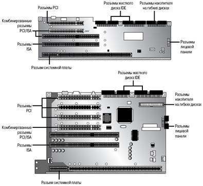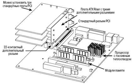 äåêàáðå 1999 ãîäà êîìïàíèÿ Intel ïðåäñòàâèëà î÷åðåäíóþ ìîäèôèêàöèþ ñèñòåìíûõ ïëàò ñåìåéñòâà ATX. Ýòà êîíñòðóêöèÿ âêëþ÷àåò â ñåáÿ äîïîëíèòåëüíûé 22-êîíòàêòíûé (2´11) ðàçúåì, ðàñïîëîæåííûé â îäíîì èç ñëîòîâ PCI ñèñòåìíîé ïëàòû, â êîòîðîì ðàçìåùàåòñÿ âåðòèêàëüíàÿ ïëàòà, ñîäåðæàùàÿ, â ñâîþ î÷åðåäü, äâà èëè òðè ðàçúåìà. Ýòà ïëàòà ïîçâîëÿåò óñòàíîâèòü äâå èëè òðè äîïîëíèòåëüíûå ïëàòû PCI. Ñëåäóåò çàìåòèòü, ÷òî äàííàÿ êîíñòðóêöèÿ íå ïîääåðæèâàåò AGP. Ñèñòåìíûå ïëàòû ñåìåéñòâà ATX îáû÷íî óñòàíàâëèâàþòñÿ â âåðòèêàëüíî ðàñïîëîæåííûõ êîðïóñàõ, íî â íåêîòîðûõ ñëó÷àÿõ áîëåå ïðèåìëåìà íàñòîëüíàÿ ñèñòåìà ñ ãîðèçîíòàëüíîé êîìïîíîâêîé. Ïðè óñòàíîâêå ïëàòû ATX â ãîðèçîíòàëüíûé êîðïóñ âûñîòà ïëàòû PCI äîñòèãàåò 4,2 äþéìà, ÷òî ïðèâîäèò ê óâåëè÷åíèþ âûñîòû êîðïóñà ïî êðàéíåé ìåðå äî 6-7 äþéìîâ.  íàñòîëüíûõ ñèñòåìàõ Slimline ÷àùå âñåãî èñïîëüçóþòñÿ ñèñòåìíûå ïëàòû NLX, áîëåå ñëîæíàÿ êîíñòðóêöèÿ êîòîðûõ çíà÷èòåëüíî óâåëè÷èâàåò îáùóþ ñòîèìîñòü ñèñòåìû. Êàê ñëåäñòâèå ýòîé ïðîáëåìû, âîçíèê âîïðîñ î ïîèñêå áîëåå äåøåâûõ ñïîñîáîâ èñïîëüçîâàíèÿ ñòàíäàðòíûõ ïëàò ôîðìôàêòîðà ATX â íàñòîëüíûõ ñèñòåìàõ Slimline. Íàèáîëåå ïåðñïåêòèâíûì ðåøåíèåì ñòàëî ñîçäàíèå ìàëîãàáàðèòíîé êîíñòðóêöèè ïëàòû PCI. 14 ôåâðàëÿ 2000 ãîäà ñïåöèàëèñòàìè ãðóïïû Peripheral Component Interconnect Special Interest Group (PCI SIG) áûëà ïðåäñòàâëåíà ñïåöèôèêàöèÿ PCI Low-Profile, êîòîðàÿ â íàñòîÿùåå âðåìÿ èñïîëüçóåòñÿ ïðè ðàçðàáîòêå óìåíüøåííûõ (äî 2,5 äþéìà) ïëàò PCI. Íîâàÿ ñïåöèôèêàöèÿ PCI ïîêà íå ïîëó÷èëà øèðîêîãî ðàñïðîñòðàíåíèÿ, ïîýòîìó êîìïàíèÿ Intel îñòàíîâèëàñü íà êîíñòðóêöèè ATX Riser, êîòîðàÿ ïîçâîëÿåò ïðèìåíÿòü ïëàòû PCI ñòàíäàðòíîé âûñîòû â ñèñòåìàõ ñòîå÷íîãî èñïîëíåíèÿ è ñèñòåìàõ Slimline. Ïðè äîáàâëåíèè 22-êîíòàêòíîãî ðàçúåìà ðàñøèðåíèÿ ê îäíîìó èç ñëîòîâ PCI â ñèñòåìíîé ïëàòå ãåíåðèðóþòñÿ äîïîëíèòåëüíûå ñèãíàëû, íåîáõîäèìûå äëÿ ïîääåðæêè ïëàòû ATX Riser, ñîäåðæàùåé äâà èëè òðè ðàçúåìà.  ýòè ðàçúåìû ìîãóò áûòü ïîäêëþ÷åíû ïëàòû PCI ñòàíäàðòíîé äëèíû. Ñëåäóåò çàìåòèòü, ÷òî ñèñòåìíàÿ ïëàòà ìîæåò èñïîëüçîâàòüñÿ êàê ñ ïëàòîé ATX Riser, òàê è áåç íåå. Îäíàêî åñëè ïëàòà ATX Riser óñòàíîâëåíà, òî îñòàâøèåñÿ ðàçúåìû PCI ñèñòåìíîé ïëàòû íå èñïîëüçóþòñÿ; ñëåäîâàòåëüíî, äëÿ ïîäêëþ÷åíèÿ ïëàò ðàñøèðåíèÿ ïðèäåòñÿ ñäåëàòü âûáîð ìåæäó ñèñòåìíîé ïëàòîé èëè ATX Riser. Ïëàòà ATX Riser ïðåäíàçíà÷åíà èñêëþ÷èòåëüíî äëÿ ïëàò PCI (îòñóòñòâóåò ïîääåðæêà ïëàò AGP èëè ISA). Íà ðèñ. 5 ïîêàçàíà ñèñòåìíàÿ ïëàòà ATX ñ óñòàíîâëåííîé ïëàòîé ATX Riser.