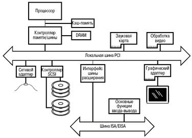 íà÷àëå 1992 ãîäà Intel îðãàíèçîâàëà ãðóïïó ðàçðàáîò÷èêîâ, ïåðåä êîòîðîé áûëà ïîñòàâëåíà çàäà÷à - ðàçðàáîòàòü íîâóþ øèíó, â êîòîðîé áûëè áû óñòðàíåíû âñå íåäîñòàòêè øèí ISA è EISA.  èþíå 1992 ãîäà áûëà âûïóùåíà ñïåöèôèêàöèÿ øèíû PCI âåðñèè 1.0, êîòîðàÿ ñ òåõ ïîð ïðåòåðïåëà íåñêîëüêî èçìåíåíèé. Ñîçäàòåëè PCI îòêàçàëèñü îò òðàäèöèîííîé êîíöåïöèè, ââåäÿ åùå îäíó øèíó ìåæäó ïðîöåññîðîì è îáû÷íîé øèíîé ââîäà-âûâîäà. Âìåñòî òîãî ÷òîáû ïîäêëþ÷èòü åå íåïîñðåäñòâåííî ê øèíå ïðîöåññîðà, âåñüìà ÷óâñòâèòåëüíîé ê ïîäîáíûì âìåøàòåëüñòâàì, îíè ðàçðàáîòàëè íîâûé êîìïëåêò ìèêðîñõåì êîíòðîëëåðîâ äëÿ ðàñøèðåíèÿ øèíû (ðèñ. 12). PCI äîáàâëÿåò ê òðàäèöèîííîé êîíôèãóðàöèè øèí åùå îäèí óðîâåíü. Ïðè ýòîì îáû÷íàÿ øèíà ââîäà-âûâîäà íå èñïîëüçóåòñÿ, à ñîçäàåòñÿ ôàêòè÷åñêè åùå îäíà âûñîêîñêîðîñòíàÿ ñèñòåìíàÿ øèíà ñ ðàçðÿäíîñòüþ, ðàâíîé ðàçðÿäíîñòè äàííûõ ïðîöåññîðà. Êîìïüþòåðû ñ øèíîé PCI ïîÿâèëèñü â ñåðåäèíå 1993 ãîäà, è âñêîðå îíà ñòàëà íåîòúåìëåìîé ÷àñòüþ êîìïüþòåðîâ âûñîêîãî êëàññà. Òàêòîâàÿ ÷àñòîòà ñòàíäàðòíîé øèíû PCI ðàâíà 33 ÌÃö, à ðàçðÿäíîñòü ñîîòâåòñòâóåò ðàçðÿäíîñòè äàííûõ ïðîöåññîðà. Äëÿ 32-ðàçðÿäíîãî ïðîöåññîðà ïðîïóñêíàÿ ñïîñîáíîñòü ñîñòàâëÿåò 132 Ìáàéò/ñ: 33 ÌÃö ´ 32 áèò = 1 056 Ìáèò/ñ; 1056 Ìáèò/ñ: 8 = 132 Ìáàéò/ñ.  íàñòîÿùåå âðåìÿ 64-ðàçðÿäíûå øèíû èëè øèíû ñ ðàáî÷åé ÷àñòîòîé 66 è 133 ÌÃö èñïîëüçóþòñÿ òîëüêî â ñèñòåìíûõ ïëàòàõ ñåðâåðîâ èëè ðàáî÷èõ ñòàíöèé. Îäíî èç îñíîâíûõ ïðåèìóùåñòâ øèíû PCI çàêëþ÷àåòñÿ â òîì, ÷òî îíà ìîæåò ôóíêöèîíèðîâàòü îäíîâðåìåííî ñ øèíîé ïðîöåññîðà. Ýòî ïîçâîëÿåò ïðîöåññîðó îáðàáàòûâàòü äàííûå âíåøíåé êýø-ïàìÿòè îäíîâðåìåííî ñ ïåðåäà÷åé èíôîðìàöèè ïî øèíå PCI ìåæäó äðóãèìè êîìïîíåíòàìè ñèñòåìû.