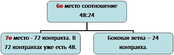 Строительство организации начинается с 7 го места. Затем активируется место 6. Когда под 7м местом закрывается цикл, для закрытия цикла 6 му месту необходимо соотношение всего 24 контракта, т.к. в левой ветке уже прошло 72 контракта и срабатывает соотношение 48:24