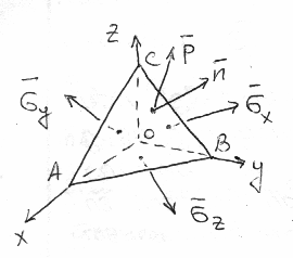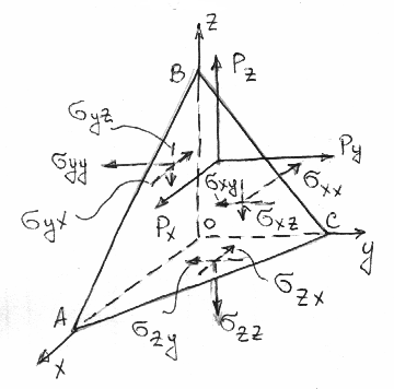 Рассмотрим в некоторой точке деформируемого тела бесконечно малый тетраэдр. По каждой грани выделенного из тела тетраэдра действуют свои векторы напряжений