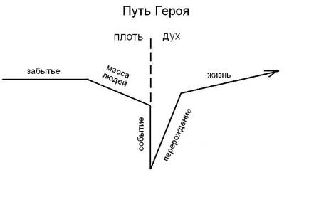 Первоначальный неловкий испуг прошёл, и я перешёл к разъяснениям. – В течение последней пары месяцев я несколько раз был поражён, когда наблюдал, какими путями мы отгораживаемся от собственных жизней – от Жизни. Я поделюсь с вами некоторыми из них. Одна моя подруга всю жизнь изучала Германа Мелвилла, но по какой-то причине она никогда не проводила связи между его трудами, особенно "Моби Диком", и своей жизнью. Каким-то образом она оставалась лично незатронутой. Потом мой друг Кертис, – я указал на него, – рассказал мне, что делал интересную газету по первому фильму "Звёздных войн" на тему описания Джозефом Кэмпбеллом "Пути Героя", но когда я спросил его, чему он научился в своей жизни в процессе этого, он не смог ничего сказать. Я правильно говорю? – спросил я Кертиса, и он кивнул. – Потом, посредством причудливого стечения обстоятельств я попал на одно из ваших собраний, и здесь я увидел то же самое – такое странное поведение, когда мы преуменьшаем яркие проявления полного потенциала жизни до бесплодных интеллектуальных моделей, которые почему-то к нам не применимы. Очевидно, это один из защитных механизмов эго. Для тех из вас, кто не был удостоен чести наблюдать моё выступление в прошлом месяце, – некоторые усмехнулись, – я указал на то же самое, о чём говорил тогда, и что собираюсь обсудить сегодня – что жизнь это не зрелищный спорт, что каждый из нас является её участником, как и любой другой человек в любые времена, и что такие истории, как "Звёздные войны" или "Бхагавад-Гита", это не чьи-то истории, а наши с вами. Что мы свои собственные герои, герои своей жизни. Вот о чём вселенная, как всегда, не слишком прозрачно намекнув, предложила мне поговорить сегодня. Окей? Все изобразили улыбки и закивали, но, похоже, слушали внимательно. – Думаю, одной из причин такого искусственного дистанцирования является богоподобность тех, кого мы признаём героями, и мифические измерения их путей. Наилучшими примерами этого могут служить такие люди, как Иисус и Будда, которых изобразили в карикатурном виде, как героев комиксов, отодвинув их далеко за пределы всего, чем обычный человек мечтает стать. В таком же духе, "Звёздные войны" это битва за галактический мир, а "Бхагавад-Гита" происходит между двумя огромными армиями, готовыми к бою. Я думаю, никто из вас не собирается после этой встречи отправиться на поиски святого Грааля, или уничтожать Кольцо Могущества. Это качество – большие пропорции – выводит Путь Героя за пределы человеческих масштабов и делает его каким-то Олимпийским, вне досягаемости смертных. Даже если это обычный Джо, как в "Джо против Вулкана" или в "Волшебнике из страны Оз", всё равно кажется, что всё это из области фантазий и сказок, а не из реальной жизни. Итак, я бы хотел попытаться сейчас придать всему этому такие размеры, с которыми мы смогли бы работать, и смогли бы увидеть, кто такой реальный герой, и что такое реальный путь. Озадаченные взгляды. Люди ждали, внимая. Для меня это необычно. Можно сосчитать на одной руке, сколько раз я выступал перед незнакомыми мне людьми. Можно сосчитать на одном пальце, сколько раз я использовал диаграмму. – Сначала я разъясню эту диаграмму на доске, а потом я бы хотел зачитать одно письмо, которое принёс с собой, и рассмотреть, как путь одной женщины сравним с великими мифами и легендами. Я повернулся к
