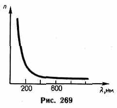 разлагая свет в спектр, можно определить его спектральный состав. Рассмотрим различия в дифракционном и призматическом спектрах. 1. Дифракционная решетка разлагает падающий свет непосредственно по длинам волн (см. (180.3)), поэтому по измеренным углам (по направлениям соответствующих максимумов) можно вычислить длину волны. Разложение света в спектр в призме происходит по значениям показателя преломления, поэтому для определения длины волны света надо знать зависимость n =f (l) (185.1). 2. Составные цвета в дифракционном и призматическом спектрах располагаются различно. Из (180.3) следует, что в дифракционной решетке синус угла отклонения пропорционален длине волны. Следовательно, красные лучи, имеющие большую длину волны, чем фиолетовые, отклоняются дифракционной решеткой сильнее. Призма же разлагает лучи в спектр по значениям показателя преломления, который для всех прозрачных веществ с увеличением длины волны монотонно уменьшается (рис. 269). Следовательно, красные лучи, имеющие меньший показатель преломления, чем фиолетовые, отклоняются призмой слабее. Величина D=dn/dl. называемая дисперсией вещества, показывает, как быстро изменяется показатель преломления с длиной волны. Из рис. 269 следует, что показатель преломления для прозрачных веществ с уменьшением длины волны монотонно увеличивается; следовательно, величина dn/dl по модулю также увеличивается с уменьшением l.