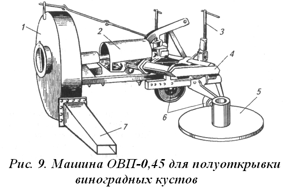 Предназначена для дооткрывки виноградных кустов после предварительной отпашки укрывного вала. Машина снабжена вентилятором 7 (рис. 2.8), почвообрабатывающим диском 5, опорными колесами 6 и механизмом передачи 2. Почвообрабатывающий диск, установленный на вертикальной оси, может свободно вращаться. Подвеска диска снабжена пружиной, прижимающей диск к укрывному валу. При движении машины винтовым механизмом 3 диск заглубляют в почву укрывного вала. В результате трения о почву диск вращается и рыхлит почву, которую выдувает вентилятор, направляющий струю воздуха через сопло 7 в зону действия диска. Положение диска по высоте изменяют, вращая винты механизмов 3 опорных колес, а силу прижатия дисков к почве — изменяя натяжение пружин. Высоту расположения сопла над уровнем почвы в пределах 205...380 мм регулируют изменением длины верхней тяги. Рабочая скорость машины до 3 км/ч, производительность до 0,43 га/ч.