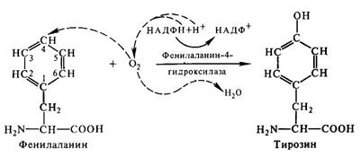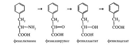 При врожденном отсутствии в печени и почках оксидазы гомогентизиновой кислоты с мочой выделяются большие ее количества. Окисляясь кислородом воздуха, она придает моче темную окраску. В тяжелых случаях наблюдается отложение пигмента в тканях и потемнение носа, ушей и склеры. Заболевание называется алкаптонурия. Существует наследственный дефект, проявляющийся в синтезе неактивных форм фермента фенилаланингидроксилазы. Концентрация фенилаланина в тканях больного повышается в десятки раз. Значительная его часть превращается в фенилпировиноградную и фенилмолочную кислоты. Они выделяются с мочой больного. Болезнь называется фенилкетонурия.