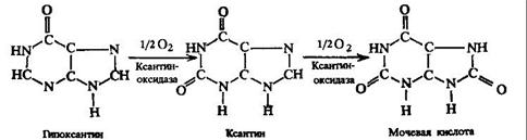 Распад НК. Под влиянием ферментов желудка, частично соляной кислоты, нуклеопротеины пищи распадаются на полипептиды и НК. Распад НК происходит в тонкой кишке гидролитическим путем под действием нуклеаз панкреатического сока. Они принадлежат к фосфодиэстеразам. Существуют эндонуклеазы и экзонуклеазы, рибонуклеазы и дезоксирибонуклеазы. Продуктами гидролиза являются мононуклеотиды и олигонуклеотиды. Нуклеазы расщепляют молекулы НК и в тканях. Распад нуклеозидфосфатов. Первая ступень - отщепление остатка фосфорной кислоты. На второй ступени происходит перенос остаткарибозы от нуклеозида на фосфорную кислоту. Эта реакция ускоряется рибозилтрансферазами. Ф-У-А ® Ф + У-А; У-А + Ф ® У-Ф + А Распад пуриновых оснований начинается с дезаминирования тех из них, которые обладают аминогруппами. Участвуют специфические аминогидролазы. аденин ® гипоксантин; гуанин ® ксантин Гипоксантин и ксантин окисляются в мочевую кислоту, фермент – ксантиноксидаза.