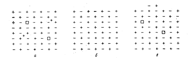 Рис. 9. Образование дефектов в кристаллической решётке: а – кристалл с дефектами по Френкелю; б – идеальный кристалл; в – кристалл с дефектами по Шоттки [3, стр. 307]. Дефекты по Френкелю. Катион или анион перемещается из своего нормального равновесного положения (узла) в промежуточное положение (междоузлие), образуя ион внедрения и вакансию, т.е. незанятый узел решётки (рис. 9а). Дефекты в виде катионов в междоузлиях и катионных вакансий более распространены, чем дефекты в виде анионов в междоузлиях и анионных вакансий. Дефекты по Шоттки. Катион и анион перемещаются из своих нормальных равновесных положений на поверхность кристалла, образуя катионную и анионную вакансии в равных количествах (рис. 9в). Теперь рассмотрим причины, вызывающие образование дефектов. Повышение температуры (тепловые дефекты). Даже в идеальном при 0 К кристалле с повышением температуры возникают дефекты. Это происходит потому, что повышение температуры способствует перемещению ионов кристалла на его поверхность (дефекты по Шоттки), смещению ионов в промежуточные положения (дефекты по Френкелю), а также взаимному замещению ионами друг друга в решётке кристалла. Примеси (примесные дефекты). В узлах решетки часть основных ионов заменена ионами примеси – твёрдые растворы замещения, или ионы примеси находятся в промежуточных положениях решётки – твёрдые растворы внедрения. Можно сказать, что наличие тех или иных дефектов в реальных кристаллах определяется условиями образования этих кристаллов. Установлено, что дефекты влияют на электрические, магнитные и оптические свойства кристаллов и что химические реакции в твёрдых фазах протекают благодаря присутствию дефектов. Применяемые на практике материалы даже чисто кристаллического строения в подавляющем большинстве случаев представляют собой или мелкокристаллические порошкообразные продукты, или системы, состоящие из большого числа мелких кристаллов (поликристалличность), одинаковых или различных по составу, связанных в одно твёрдое тело, как это имеет место, например, в металлических сплавах и в большей части горных пород. При этом нередко кристаллы основных веществ разделяются тонкой прослойкой, содержащей различные примеси. Поверхность кристалла часто обладает мозаичной структурой, т.е. состоит из отдельных участков (блоков), несколько различно ориентированных или разделённых один от другого трещинами. [1, стр. 143÷144]. Неравновесные дефекты. Линейные дефекты или дислокации. Дислокациями называют линейные нарушения в решётке кристалла. Дислокации бывают двух видов: краевые и винтовые.