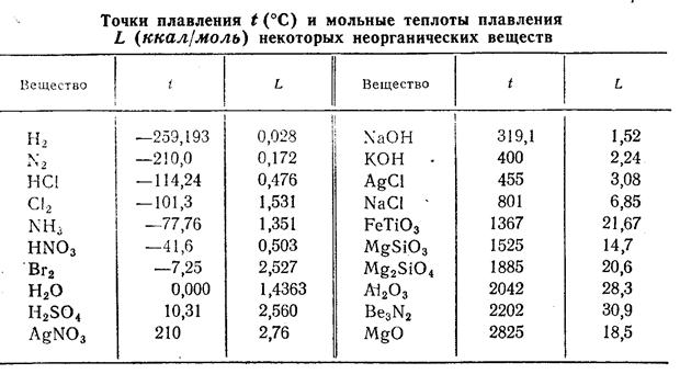 Температуры и теплоты плавления кристаллов. [1, стр. 150÷152]. Температура плавления кристаллов данного вещества зависит от внешнего давления, от присутствия примесей и для высокодисперсных порошков – также от степени дисперсности[14]. Эти зависимости мы будем рассматривать позднее; здесь же ограничимся температурами плавления только чистого вещества и только при атмосферном давлении. Температура плавления при атмосферном давлении называется также точкой плавления. Её называют иначе температурой (или точкой) отвердевания данного вещества. Для веществ с низкой температурой плавления (ниже 15÷20ºС) её называют также температурой (точкой) замерзания. Табл. 1 [1, стр. 150].