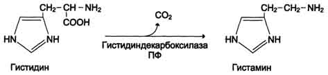 24)Образование серотонина и гистамина. Роль аминов Гистамин образуется путем декарбоксилирования гистидина в тучных клетках соединительной ткани Гистамин образует комплекс с белками и сохраняется в секреторных гранулах тучных клеток. Секретируется в кровь при повреждении ткани (удар, ожог, воздействие эндо- и экзогенных веществ), развитии иммунных и аллергических реакций. Гистамин выполняет в организме человека следующие функции: