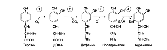 В мозговом веществе надпочечников и нервной ткани тирозин является предшественником катехоламинов(дофамина, норадреналина, адреналина). При образовании катехоламинов и меланина (в меланоцитах) промежуточным продуктом служит диоксифенилаланин (ДОФА). Однако гидроксилирование тирозина в клетках различных типов катализируется различными ферментами: - Тиразиназа (Cu-зависимый фермент) - Тирозингидроксилаза (1) - ДОФА – декарбоксилаза (2) - дофамингидроксилаза (3) - фенилэтаноламин-N-метилтрансфераза (4) дофамин и норадреналин служат медиаторами в синаптической передаче нервных импульсов, а адреналин – гормон широкого спектра действия, регулирующий энергетический обмен. Одна из функций катехоламинов – регуляция деятельности ССС.