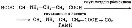 В нервных клетках декарбоксилирование глутамата (отщепление а-карбоксильной группы) приводит к образованию γ-Аминомасляной кислоты(ГАМК), которая служит основным тормозным медиатором высших отделов мозга. Содержание ГАМК в головном мозге в десятки раз выше других нейромедиаторов. Она увеличивает проницаемость постсинаптическизх мембран для ионов К+, что вызывает торможение нервного импульса, повышает дыхательную активность нервной ткани, улучшает кровоснабжение головного мозга.