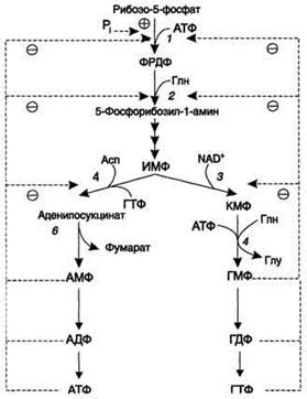 Основным показателем, от которого зависит синтез пуриновых нуклеотидов, служит концентрация ФРДФ, которая, в свою очередь, зависит от скорости его синтеза, утилизации и разрушения. Количество ФРДФ определяется доступностью рибозо-5-фосфата и активностью ФРДФ синтетазы - фермента, чувствительного к концентрации фосфата и пуриновых нуклеотидов. Внутриклеточная концентрация ФРДФ строго регулируется и обычно низкая. ФРДФ синтетаза - аллостерический фермент. Он активируется неорганическим фосфатом (Рi) и ингибируется пуриновыми нуклеозид- моно-, ди- и трифосфатами, которые по эффективности ингибирования распределяются в следующем порядке: НМФ > НДФ > НТФ (рис. 10-8). ФРДФ служит не только субстратом, но и аллостерическим активатором второй реакции синтеза пуринонуклеотидов de novo, которую катализирует амидофосфорибозилтрансфераза.
