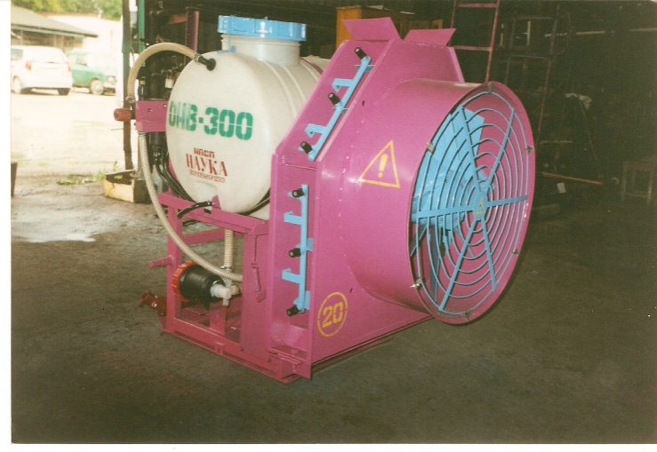 Машина предназначена для химической борьбы с болезнями и вредителями в садах, виноградниках. Может использоваться для проведения санитарных обработок складских помещений для хранения зерновых культур, а также птичников и животноводческих ферм. Машина оборудована мембранным насосом отечественного производства, заборным фильтром с отсечным устройством, регулятором давления с управляющими клапанами и четырьмя коллекторами с распыливающими форсунками. Наличие четырех попарно расположенных с обеих сторон опрыскивателя коллекторов, которые могут независимо друг от друга включаться в работу, позволяют качественно производить обработку плантаций с различной формировкой растений при минимальных расходах ядохимикатов в пределах 400…500 л/га. Привод рабочих органов механический от ВОМ трактора через карданный вал и двухступенчатую цепную передачу. Крыльчатка вентилятора выполнена из листового стального материала и легко поддается ремонту в условиях эксплуатирующих машину хозяйств. Навешивание, эксплуатация, обслуживание и текущий ремонт машины осуществляет один человек (тракторист-машинист). Машина в агрегате с трактором может работать на склонах крутизной до 100.