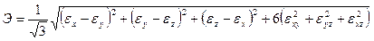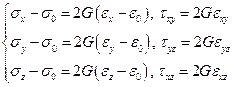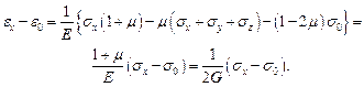 Его можно разложить на сумму двух состояний – трёхосное растяжение и сложный сдвиг в трёх координатных плоскостях. На основании принципа независимости действия сил (напряжений), используя (19) и Уравнения (20) можно разрешить относительно напряжений: где Коэффициент Из (20), (21) следует ещё одна форма записи обобщённого закона Коши – Гука в форме трёх законов: 1. Закон упругого изменения объёма Складывая в (20) относительные удлинения, получаем: где 2. Закон упругого формоизменения Составим на основании (20), (23) выражение: Аналогично можно найти разности представляющие закон упругого формоизменения. Соотношения (24) связывают компоненты девиаторов напряжений и деформаций. 3. Закон упругого упрочнения материала Величину называют модулем девиатором напряжений. Из (24) следует: Подставляя полученные выражения в (25), находим: где величина носит название модуля-девиатора деформаций. Соотношение (26) выражает собой закон упругого упрочнения материала. В частном случае простого растяжения Таким образом, закон упругого упрочнения (26) с точностью до постоянного множителя