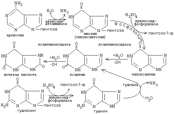 Пиримидиновые азотистые основания подвергаются тотальному разрушению до СО2, Н2О и NH3. Пуриновые азотистые основания сохраняют циклическую структуру пурина. Конечный продукт: мочевая кислота - вещество пуриновой природы.