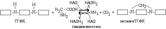 В каталитическом центре фермента, содержащего ТГФК, имеются две –NH-группы, которые участвуют в связывании активного С1. Схематически процесс можно представить так: