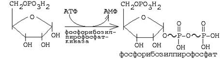 Для синтеза любого из нуклеотидов требуется активная форма рибозо-фосфата - фосфорибозилпирофосфат (ФРПФ), образующаяся в следующей реакции: