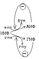Пуриновое кольцо строится из СО2, аспарагиновой кислоты, глутамина, глицина и серина. Эти вещества либо полностью включаются в пуриновую структуру, или передают для ее построения отдельные группировки. Аспарагиновая кислота отдает аминогруппу и превращается в фумаровую кислоту. Глицин: 1) полностью включается в структуру пуринового азотистого основания; 2) является источником одноуглеродного радикала. Серин: тоже является донором одноуглеродного радикала. ФРПФ + глутамин -------> глутамат + ФФ + фосфорибозиламин Фермент, который катализирует эту реакцию, называется фосфорибозиламидотрансфераза. Он является ключевым ферментом синтеза всех пуриновых мононуклеотидов. Регулируется по принципу отрицательной обратной связи. Аллостерическими ингибиторами этого фермента являются АМФ и ГМФ. На второй стадии фосфорибозиламин взаимодействует с глицином. Третья стадия - включение углеродного атома, донором которого является глицин или серин. Затем достраивается шестичленный фрагмент пуринового кольца: 4-ая стадия - карбоксилирование с помощью активной формы СО2 при участии витамина Н - биотина. 5-ая стадия - аминирование с участием аминогруппы из аспартата. 6-ая стадия - аминирование за счет аминогруппы глутамина. 7-ая, заключительная стадия - включение одноуглеродного фрагмента (с участием ТГФК), и образуется готовый ИМФ.