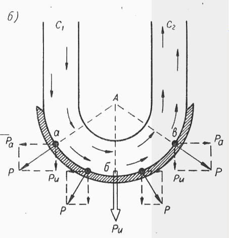 Схема простейшей одноступенчатой турбины показана на рис. 1, а. Свежий пар поступает в неподвижную насадку (сопло) 1 и в результате расширения преобразует свою потенциальную энергию в кинетическую энергию потока, приобретая большую скорость. Далее пар поступает в каналы рабочих лопаток 2 и в результате поворота струи возникает динамическое давление па лопатки, под действием которого вращается диск 3 и вал 4 турбины. На рис. 1, б изображена схема действия центробежной силы частиц пара на рабочую лопатку активной ступени. Струя пара поступает на рабочую лопатку полукруглой формы со скоростью С 1. В канале между лопатками пар совершает криволинейное движение и, изменяя направления движения, уходит со скоростью С 2.