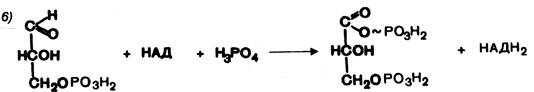 В последующих реакциях данного этапа участвует только фосфоглицериновый альдегид, и по мере его использования в него превращается фосфодиоксиацетон: Фосфодиоксиацетон Фосфоглицериновый альдегид Поэтому можно считать, что из глюкозы образуется две молекулы фосфоглицеринового альдегида. Следующая стадия – окисление фосфоглицеринового альдегида, протекающее непосредственно в цитоплазме. В ходе этой реакции от окисляемого вещества отнимаются два атом водорода и временно присоединяются к коферменту НАД. За счет выделяющейся при окислении энергии в продукт реакции включается еще один фосфатный остаток, который присоединяется макроэргической связью: