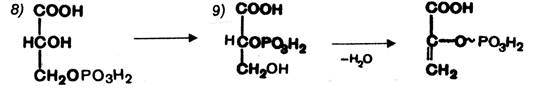 На следующей стадии фосфатный остаток, благодаря наличию макроэргической связи, легко передается на молекулу АДФ с образованием АТФ: 1,3 –дифосфоглицерат 3-фосфоглицерат Такой способ синтеза АТФ, осуществляющийся без участия тканевого дыхания и, следовательно, без потребления кислорода, обеспеченный запасом энергии субстрата, называется анаэробным или субстратным фосфорилированием. Это самый быстрый путь получения АТФ. На последующих стадиях образовавшийся 3-фосфоглицерат изомеризуется в 2-фосфоглицерат, от которого затем отщепляется молекула воды, что приводит к перераспределению энергии в молекуле и возникновению макроэргической связи:
