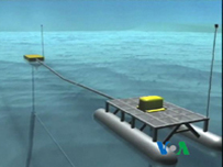 Работа ОТЭС основана на принципе, используемом в паровой машине. Используется принцип замкнутого цикла: насос закачивает теплую воду океана 24-32С в теплообменник, куда уже поступили легкоиспаряющиеся жидкости с пониженной температурой кипения (пропан, аммиак, фреон). Здесь в камере кипения рабочая жидкость, нагретая от теплой океанской воды закипает и превращается в газ. Газ, направляясь в турбогенератор, вращает его и вырабатывает электроэнергию. Далее отработанный газ поступает в конденсатор с температурой 5-6С, холодной глубинной воды (с глубины 200-500м), поданной сюда насосом, где конденсируется. Затем насосы конденсированный пар в жидком виде снова закачивают в испаритель (теплообменник). Получаемую Эл/энергию предают на берег по подводному кабелю, но ее можно использовать и на месте (для обеспечения добычи минерального сырья со дна или его выделения из морской воды). Расчетная мощность проектируемых ОТЭС составляет 250 - 400 МВт. Достоинства: · стабильный источник энергии · цикл постоянный, прерывается только при авариях. · доставка в любой район Мирового океана. Недостаток - их географическая привязанность к тропическим широтам. ОТЕC (океанотермическая конверсия). Установки ОТЕК смонтированы на барже. Под днищем располагается длинный трубопровод (полиэтиленовая трубка 700м, d 50см.) для забора холодной воды, который прикреплен к днищу с помощью особого затвора, позволяющего в случае необходимости быстро его отсоединить. Полиэтиленовая трубка дополнительно решает проблему заякоривания системы труба-судно.