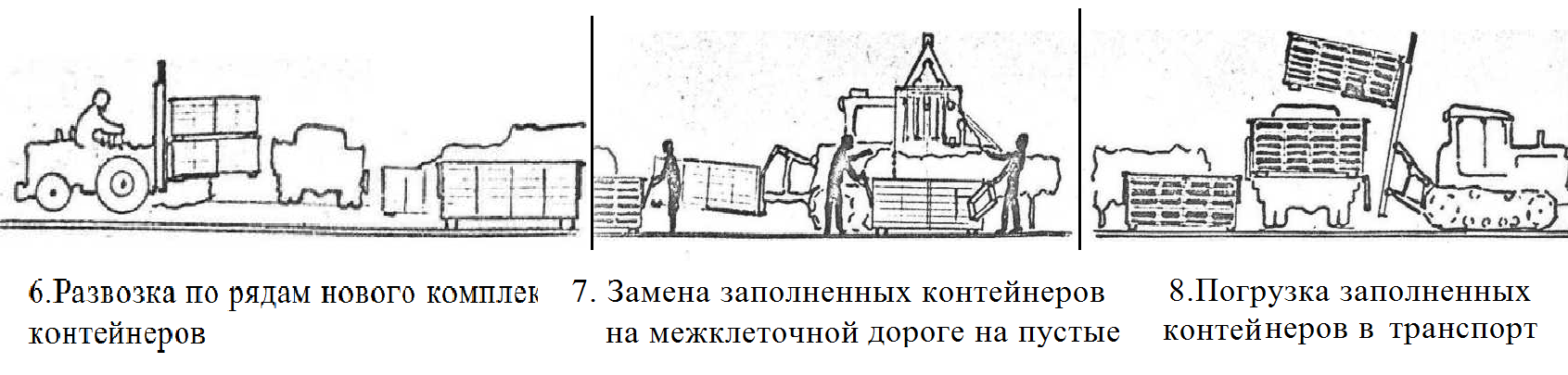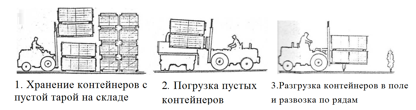 Рисунок 2.11 Общий вид линии уборки столовых сортов винограда 1-ферма; 2-контейнер; 3-рама; 4-направляющие; 5- основание; 6 – опоры; 8- стрела; траверсы; 10- кронштейн; 12-распорка; 16 – зажим; 18- подвеска; 19- удлинитель; 20-сигнал; 22 -гидроцилиндр; 23 – полки контейнера;; 24 – крючки. Технологическая линия уборки, транспортировки и хранения столовых сортов винограда. Описание технологического процесса уборки столовых сортов винограда. Контейнеры с пустыми ящиками хранятся на тарных складах или холодильниках (рис. 2.12.I). На тарном складе (или холодильнике) контейнеры с пакетом пустых ящиков грузят с помощью погрузчиков в Транспортное средство по два одновременно, поставленных один на другой, для отправки их в поле (рис. 2.12. 2), где вильчатый погрузчик АВН-0,5 или ПВСВ-0,5 сгружает контейнеры с транспортного средства и расставляет их в начале ряда так, чтобы длина контейнера была направлена вдоль оси ряда (рис. 2.12.3). Трактор агрегата также устанавливается строго по центру междурядий. К агрегату при помощи подвесок навешивают контейнеры. Сборщики готовят контейнеры к уборке, раскладывая полки и убирая на верхнюю часть контейнера пустые ящики, как показано на (рис. 2.12.4) Сборщики левого и правого крыла агрегата предупреждают тракториста о своей готовности, после чего тракторист поднимает ферму и заднюю стрелку контейнера над землей на высоту не менее 20 см. Агрегат может двигаться синхронно вместе со сборщиками, но может работать позиционно. Рисунок 2.12 Технологическая линия уборки, транспортировки и хранения столовых сортов винограда