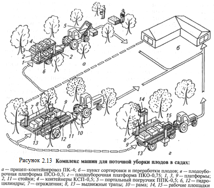 ПРОЦЕССЫ И СРЕДСТВА МЕХАНИЗАЦИИ ПРИ СБОРЕ УРОЖАЯ В САДАХ Плоды, закладываемые на длительное хранение, собирают вручную с применением специального инвентаря или плодоуборочных платформ. Плоды, потребляемые в свежем виде или предназначенные для технической переработки, убирают плодоуборочными машинами. Ручной садовый инвентарь включает в себя корзины-столбушки с крючками, плодоуборочные сумки, лестницы, скамейки. Чтобы снять плоды с отдаленной части кроны, применяют пневматические режущие или вибрационные плодосъёмники. Грозди винограда срезают ножами, ножницами или секаторами, а плоды ягодников счесывают гребенками или ручными вибраторами. Для накопления и транспортировки плодов в междурядьях садов устанавливают контейнер КСП-0,5, а в виноградниках — бункер-накопитель БКВ-2,8 или саморазгружающийся прицеп ТВЦ-2. В эти емкости рабочие-сборщики выгружают из корзин собранные плоды. Затаренные контейнеры вывозят из междурядий и загружают в транспорт вильчатым погрузчиком ПВСВ-0,5 или перевозят прицепами-контейнеровозами ПК-4, ВУК-3, ПТ-3,5, снабженными навесными погрузчиками. Плоды винограда, смородины, крыжовника затаривают в ящики и вывозят агрегатом АВН-0,5. Наиболее производителен и экономичен поточный способ уборки плодов, позволяющий максимально механизировать сбор, погрузку, транспортировку и послеуборочную обработку урожая. Поточные способы уборки применяют в специально подготовленных садах и виноградниках и при наличии технологических комплексов, в которые входят уборочные платформы, плодоуборочные машины, прицепы-контейнеровозы, погрузчики и стационарные линии товарной обработки плодов. Прицеп-контейнеровоз ПК-4 предназначен для вывоза из сада фруктов, затаренных в контейнеры или ящики, установленные на поддоны, а также для подвозки и расстановки в междурядьях садов порожних контейнеров. Контейнеровоз снабжен нижней 1 (рис. 2.13, а) и верхней 3 платформами, установленными одна над другой на четырех стойках 2. Стойки соединены с платформами шарнирно. Верхнюю платформу 3 двумя гидроцилиндрами б можно опускать или поднимать, сохраняя ее горизонтальное расположение. Нижняя платформа 1 снабжена цепным конвейером с гидроприводом для перемещения контейнеров по длине платформы. Прицеп-контейнеровоз агрегатируют с трактором МТЗ-80, на который навешен портальный погрузчик ППК-0,5. Для загрузки верхнюю платформу опускают и погрузчиком 5 устанавливают пять контейнеров. Затем верхнюю платформу 3 поднимают и загружают шесть контейнеров на нижнюю платформу 1. Затаренные контейнеры вывозят на пункт сортировки и переработки (рис. 2.13. б) и разгружают в обратной последовательности. Затем на контейнеровоз устанавливают порожние контейнеры, вывозят их в поле и разгружают в междурядьях. Производительность агрегата 1,23 т/ч. Портальный погрузчик ППК-0,5 предназначен для погрузки контейнеров, затаренных плодами или овощами, в транспортные средства. Погрузчик 5 (рис. 2.13. а) состоит из рамы, стрелы, грузозахватного устройства и гидросистемы. П-образная стре ла совершает возвратно-поступательное движение и может захватывать контейнеры