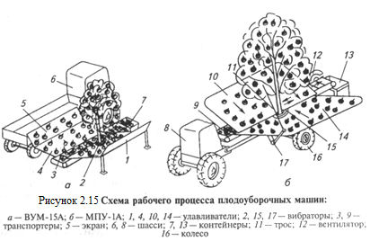 К передней и задней сторонам рамы улавливателя прикреплены скаты 5, а к боковой — откидной улавливатель 3. Над поперечными транспортерами 14 размещены ленточные амортизаторы 16, гасящие скорость падающих плодов. Продолжением наклонной части продольного транспортера 13 является полотняная горка 9, угол наклона которой можно изменять от 15 до 30° Площадка 11, предназначенная для размещения порожнего контейнера 10, подвешена к центральному брусу-раме 15 на рычагах и гидроцилиндрах. Гидроцилиндрами площадку с контейнером поднимают, чтобы уменьшить высоту падения и повреждение плодов. Правый агрегат 4 состоит из шасси, штамбового вибратора 17, основного 1 и откидного 3 улавливателей, изготовленных из эластичной мелиоративной ткани, натянутой на прямоугольные рамки. Основной улавливатель 1 установлен на ролики, его можно перемещать с помощью гидроцилиндров и выдвигать в сторону штамба до 800 мм. Штамбовый вибратор включает в себя неподвижную и подвижную челюсти, связанные между собой гидроцилиндром, вертикальные валы с дебалансной массой и упругую подвеску, прикрепленную к центральному брусу-раме 2 шасси. Валы вибратора приводят во вращение от гидромотора. Вибратор рассчитан на захват деревьев, диаметр штамба которых 150...300 мм. Амплитуда колебаний штамба в зависимости от его диаметра составляет 16...22 мм. Комбайн при уборке подъезжает к дереву и выдвигает улавливатель. Для установки улавливателей секции подводят к дереву с двух противоположных сторон так, чтобы метка на уплотнителе 18 совпадала с серединой штамба. После этого улавливатели обеих секций выдвигают их до смыкания. Затем включают вибратор. В результате колебаний плоды отрываются, падают на улавливатели 1, 3 и амортизирующие ленты 16, скатываются на поперечные транспортеры, подаются ими на продольный, а с него на разделительную горку 9. Лента горки, двигаясь навстречу потоку плодов, захватывает листья и другие примеси, уносит их вверх и сбрасывает под машину, а плоды скатываются в тару. Производительность комбайна 35...45 деревьев в час, полнота сбора плодов 91...95 %, обслуживают агрегаты 2 тракториста и 2 рабочих. Плодоуборочная машина ВУМ-15А предназначена для уборки плодов вишни, сливы и яблок с полукустовидных деревьев с диаметром кроны до 3,5 м и шириной междурядий 3...4 м. Машину навешивают на самоходное шасси Т-16М с левой стороны. Основные сборочные единицы машины: штамбовый вибратор 2 (рис. 2.15. а), транспортер 3, навесной 4 и переносной 1 полотняные улавливатели, вентилятор и механизм выдвижения транспортера. Для съема плодов агрегат въезжает в междурядье и останавливается у дерева таким образом, чтобы зажим вибратора 2 был против штамба. Включают гидроцилиндр и выдвигают транспортер 3 вместе с встряхивателем до упора подушкой в штамб дерева. Одновременно разматывается полотно навесного улавливателя 4.