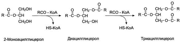 После всасывания продуктов гидролиза жиров жирные кислоты и 2-моноацилглицеролы в клетках слизистой оболочки тонкого кишечника включаются в процесс ресинтеза с образованием триацилглицеролов (рис. 8-16). Жирные кислоты вступают в реакцию этерификации только в активной форме в виде производных коэнзима А, поэтому первая стадия ресинтеза жиров - реакция активации жирной кислоты: HS КоА + RCOOH + АТФ → R-CO ~ КоА + АМФ + Н4Р2О7. Реакция катализируется ферментом ацил-КоА-синтетазой (тиокиназой). Затем ацил~КоА участвует в реакции этерификации 2-моноацилглицерола с образованием сначала диацилгли-церола, а затем триацилглицерола. Реакции ресинтеза жиров катализируют ацилтранеферазы. В реакциях ресинтеза жиров участвуют, как правило, только жирные кислоты с длинной углеводородной цепью. В ресинтезе жиров участвуют не только жирные кислоты, всосавшиеся из кишечника, но и жирные кислоты, синтезированные в организме, поэтому по составу ре-синтезированные жиры отличаются от жиров, полученных с пищей. Однако возможности "адаптировать" в процессе ресинтеза состав пищевых жиров к составу жиров организма человека ограничены, поэтому при поступлении с пищей жиров с необычными жирными кислотами,
