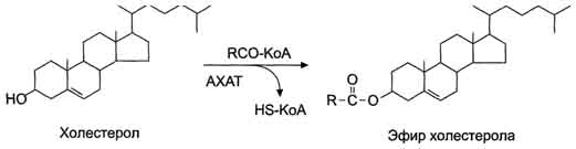 Рис. 8-17. Реакция этерификации холестерола в клетках слизистой оболочки тонкой кишки. АХАТ - ацилхолестерол-ацилтрансфераза.