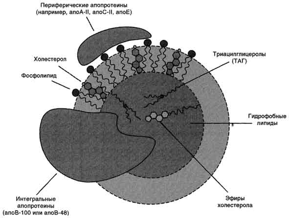 Рис. 8-18. Липопротеины плазмы крови. - фосфолипидами и холестеролом. Гидрофильные группы этих молекул обращены к водной фазе, а гидрофобные части - к гидрофобному ядру липопротеина, в котором находятся транспортируемые липиды. Некоторые апопротеины интегральные и не могут быть отделены от липопротеина, а другие могут свободно переноситься от одного типа липопротеина к другому. Апопротеины выполняют несколько функций: