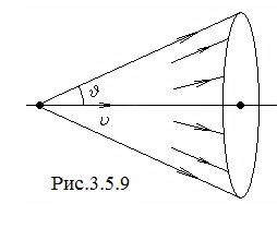 В излучении Вавилова — Черенкова преобладают короткие волны, поэтому оно имеет голубую окраску. Наиболее характерным свойством этого излучения является то, что оно испускается не по всем направлениям, а лишь вдоль образующих конуса, ось которого совпадает с направлением скорости частицы (рис.3.5.9). Угол между направлениями распространения излучения и вектором скорости частицы определяется соотношением