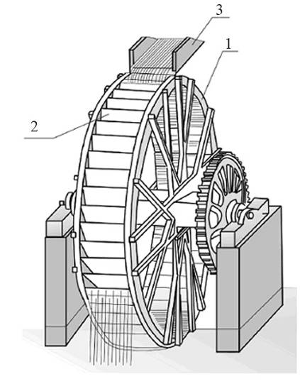Верхнебойное (наливное) колесо: 1 – колесо; 2 – ящики (лопасти колеса); 3 – подводящий лоток