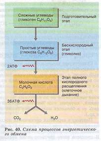Большинство живых существ, обитающих на Земле, относятся к аэробам, т. е. используют в процессах обмена веществ кислород из окружающей среды. У аэробов энергетический обмен происходит в три этапа: подготовительный, бескислородный и кислородный. В результате этого органические вещества распадаются до простейших неорганических соединений. У организмов, обитающих в бескислородной среде и не нуждающихся в кислороде, — анаэробов, а также у аэробов при недостатке кислорода ассимиляция происходит в два этапа: подготовительный и бескислородный. В двухэтапном варианте энергетического обмена энергии запасается гораздо меньше, чем в трехэтапном. Рассмотрим подробнее три этапа энергетического обмена (рис. 40). Первый этап называется подготовительным и заключается в распаде крупных органических молекул до более простых: полисахаридов — до моносахаридов, липидов — до глицерина и жирных кислот, белков — до аминокислот. Внутри клетки распад органических веществ происходит в лизосомах под действием целого ряда ферментов. В ходе этих реакций энергии выделяется мало, при этом она не запасается в виде АТФ, а рассеивается в виде тепла. Образующиеся в ходе подготовительного этапа соединения (моносахариды, жирные кислоты, аминокислоты и др.) могут использоваться клеткой в реакциях пластического обмена, а также для дальнейшего расщепления с целью получения энергии.